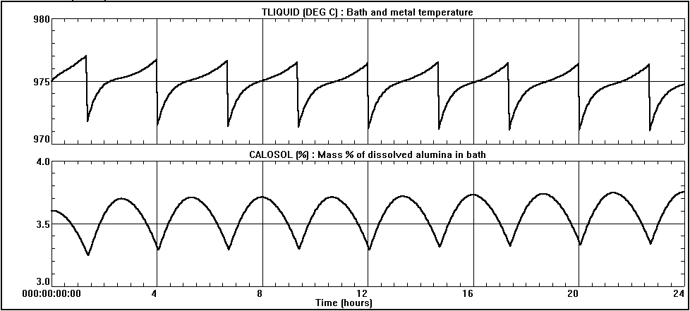 Figure 8: Time history of the bath temperature (TLIQUID) and the alumina concentration (CALOSOL) using a one day simulation with 185 kg alumina fed per break. |