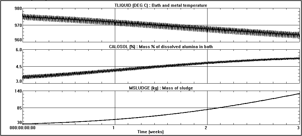 Figure 9: Time history of the bath temperature (TLIQUID), the alumina concentration (CALOSOL) and the mass of sludge (MSLUDGE) using a three week simulation with 185 kg alumina fed per break. This imbalance is a result of the uncompensated loss of the heat produced during an anode effect. The gradual increase in the alumina concentration in the bath is an indication that the pot is gradually sludging. This is confirmed by looking at the evolution of the sludge shown in figure 9. The next logical step would be to use the program to evaluate the following possibilities: 1. Adjusting the heat balance requirement by