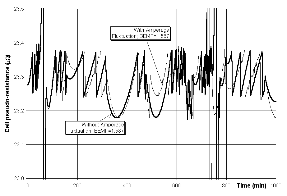 The evolution of the cell voltage and the pseudo-resistance with and without amperage fluctuation are shown in figures 9 and 10 respectively. The smooth solid line shows the case of no amperage fluctuation.
