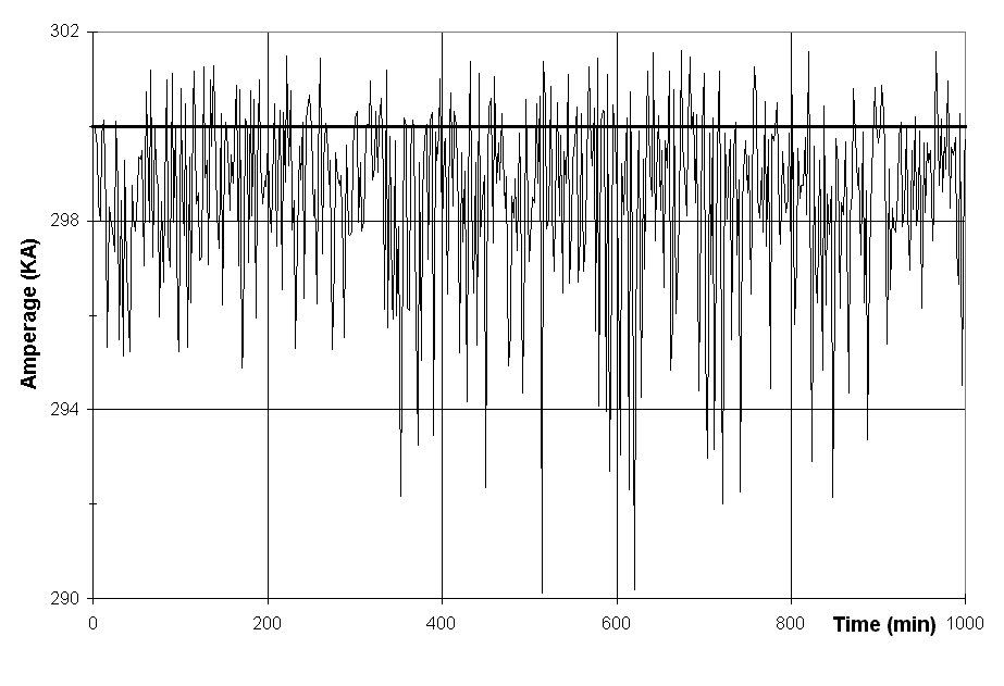 Figure 3 - Correlation between the cell amperage and the cell temperature (PBF cell with the cell temperature as the target variable) More importantly, one has to be careful what experimental data should be used to calculate the BEMF. The wrong information may lead to quite a different conclusion. Efficiency of the BEMF to Filter Amperage Noise It is unrealistic to assume that the temperature dynamic evolution can follow line amperage fluctuation. Hence, the best possible value of the BEMF to use in calculating the cell pseudo-resistance is 1.632V. We will now run the model in dynamic mode with and without amperage fluctuation activated. We will also use the "standard" value of 1.65V for the BEMF (assuming that we don´t know better). We want to investigate how well we are able to filter out the impact of the amperage fluctuation on the dynamic evolution of the cell pseudo-resistance. Figure 4 shows the amperage variation with time as calculated using the amperage fluctuation submodel. The nominal current of 300 kA is also shown on the figure. This curve is typical of the fluctuations recorded in operating pot lines.