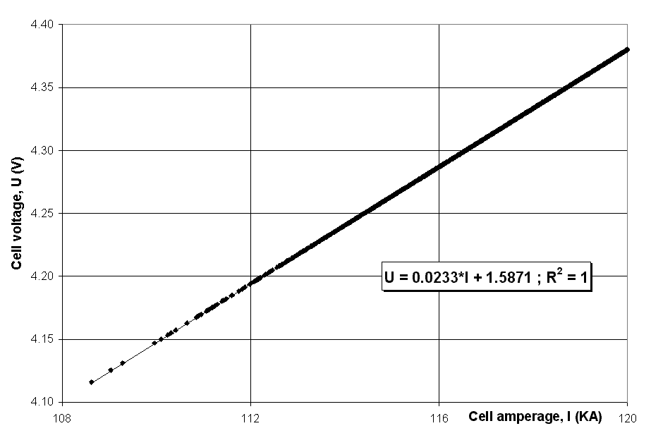 Side Break Söderberg Cell As second case study we will use the side break Söderberg cell operating at 120 kA presented as the validation test case of the dynamic model [1]. Side broken cell technology typically suffers from greater amplitudes of amperage fluctuation due to the higher incidence of anode effects, so let us verify if the above conclusions are valid in this case. The variation of cell voltage with amperage is shown in figure 7. The first major difference you see is that the BEMF characteristic of this cell design is 1.587V which is significantly lower than the 1.65V quoted value. This confirms the view that the BEMF does vary with cell technology and the variation can be significant.