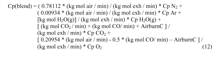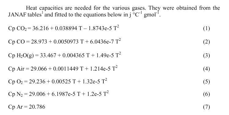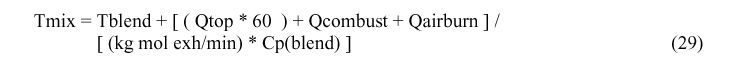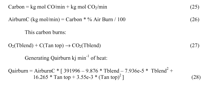 First we must calculate the air drawn in under the hoods at potroom temperature, and combine it with the CO2 and CO escaping at electrolyte temperature to produce a gas blend at temperature, Tblend. The CO of the mixture burns, generates heat, forms more CO2, and consumes O2 from the air drawn in. Also, heat is generated by air burning of the anode forming additional CO2 and consuming O2. The heats of combustion of CO and air burning of anode carbon plus the heat from the cover and anode stubs raise the temperature of the mixture of gases to temperature, Tmix.