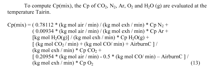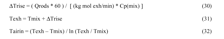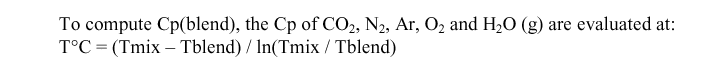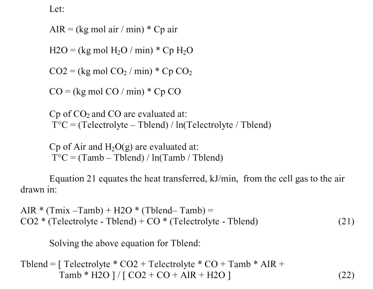 This gas mixture then extracts heat from the anode rods and rises to the exhaust temperature, Texh. In order to compute Tblend, Tmix and Texh, the heat capacities of the gas mixtures is needed. Finally, Tairin is calculated as the log mean of Tmix and Texh, just as the log mean of inlet and outlet temperatures are used to calculate heat transfer in heat exchangers.