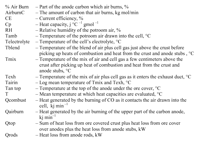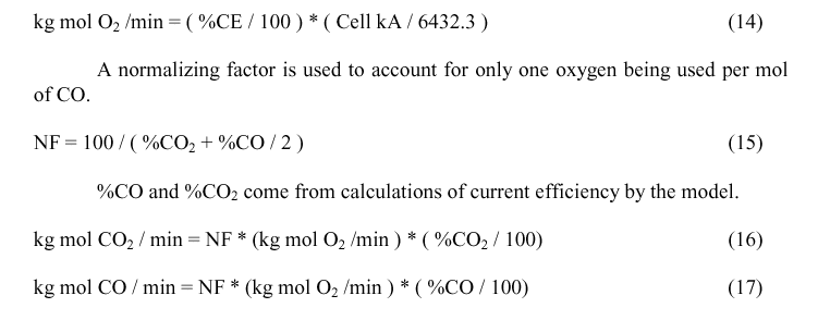 It is assumed the cell is so designed that the air is drawn in uniformly around the periphery of the cell, that it mixes uniformly with the cell gas producing a gas mixture at an initial temperature, Tblend. The CO of this gas mixture burns to CO2 at temperature, Tblend, consuming some of the oxygen and generating heat, Qcombust. Also some of the oxygen of this mixture air burns the tops of the anodes generating CO2 at temperature Tblend and generates heat, Qairburn. The combination of Qcombust, Qairburn and Qtop heats this gas mixture raising its temperature to Tmix. As this gas rises, it extracts heat from the anode rods raising the gas temperature to Texh. This gas mixture then exits uniformly into a slotted gas collection duct extending the length of the cell at the top of the superstructure. Tairin is taken as the log mean of Tmix and Texh.