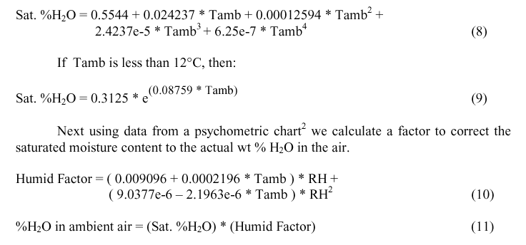 The moisture content of the air drawn in has a significant effect on the heat capacity of the air. To get the percent moisture in the ambient air first we calculate the mass % water in water saturated air2 based on the temperature of the air in the potroom.