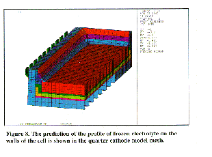 Figure 8 shows the prediction of the profile of frozen electrolyte on the walls of the cell. The precise manner by which an aluminum reduction cell loses heat depends upon the thermal insulation in the cell. Furthermore, erosion of the side wall carbon which can lead to early failure is prevented by the formulation of frozen electrolyte. A thermo-electric model of a quarter cell was developed to calculate the heat balance in the cell and predict the freeze profile. Nonlinear material properties and surface films that model convection and radiation heat transfer were used. The geometry was built parametrically to allow for easy evaluation of design alternatives.