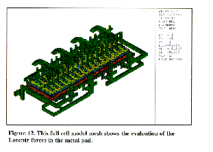Figure 11 shows the development of a generic model to calculate the current density distribution. With the enhancements made to APDL introduced at ANSYS Revision 5.0, it was possible to develop a generic parametric model of a reduction cell. The model generation, solution, and postprocessing were automated. The user input was limited to parameter values that define the cell characteristics and boundary conditions. Alternative designs could be easily analyzed and optimized using the model. The evaluation of the Lorentz forces in the metal pad is shown in Figure 12. The introduction at ANSYS Revision 5.0 of the generalized potential approach for solving magnetic field problems and the |